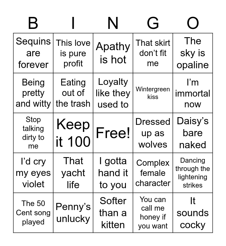 This bingo card has a free space and 32 words: You can call me honey if you want, Honing your powers, Keep it 100, Passive aggressive at the bar, I’d cry my eyes violet, Eating out of the trash, The sky is opaline, Dancing through the lightening strikes, This love is pure profit, I protect the family, Loyalty like they used to, Apathy is hot, Terminal uniqueness, First crush crushes something kind, Dressed up as wolves, Should’ve kissed you anyway, The 50 Cent song played, Stop talking dirty to me, I gotta hand it to you, That yacht life, Complex female character, Boss up, settle down, Daisy’s bare naked, Penny’s unlucky, It sounds cocky, That skirt don’t fit me, Wintergreen kiss, Being pretty and witty, Sequins are forever, Softer than a kitten, Ice inside my veins and I’m immortal now.