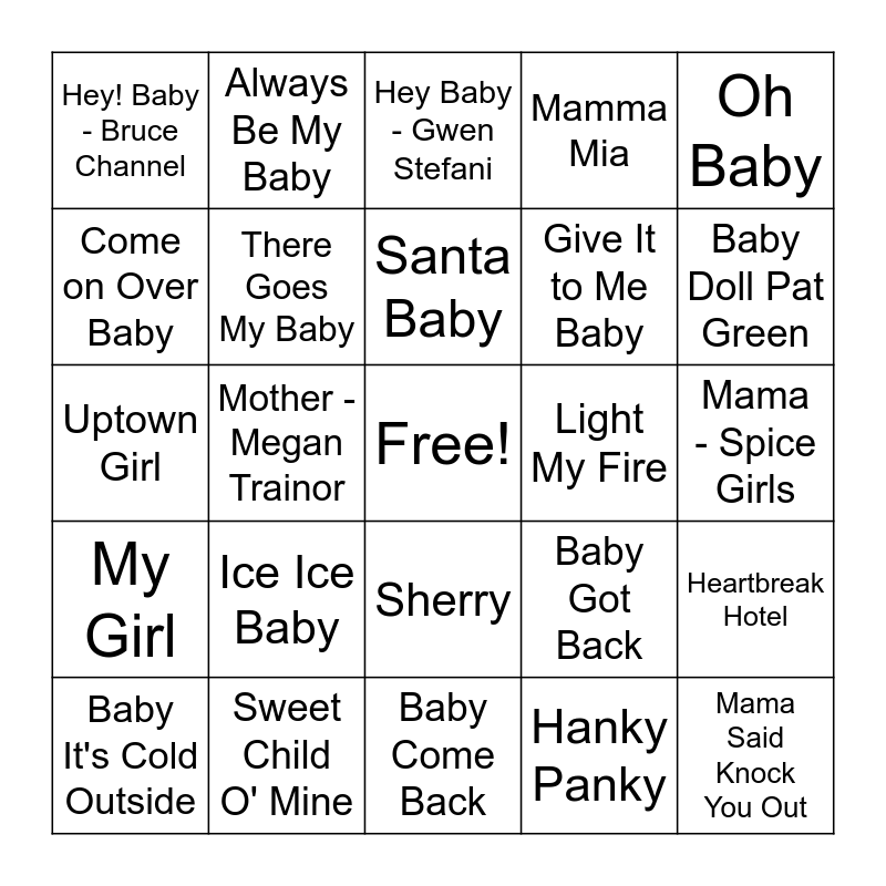 This bingo card has a free space and 40 words: What a Girl Wants, Uptown Girl, Twist and Shout, There Goes My Baby, Sweet Child O' Mine, Sherry, Santa Baby, Push It, Oh Baby, My Girl, Mother - Megan Trainor, Mamma Mia, Mama Said Knock You Out, Mama - Spice Girls, Light My Fire, Ice Ice Baby, I Got You Babe, Hey! Baby - Bruce Channel, Hey Baby Que Paso, Hey Baby - Gwen Stefani, Heartbreak Hotel, Hanky Panky, Give It to Me Baby, Come on Over Baby, Chantilly Lace The Big Bopper, Can't Get Enough of You Baby, Blue Jean Baby, Be-Bop-A-Lula The Beatles, Bang Bang (My Baby Shot Me Down), Baby Shark, Baby Love, Baby It's Cold Outside, Baby I'm Yours, Baby Got Back, Baby Doll Pat Green, Baby Come Back, Baby Boy, Baby Justin Bieber, Always Be My Baby and ...Baby One More Time.