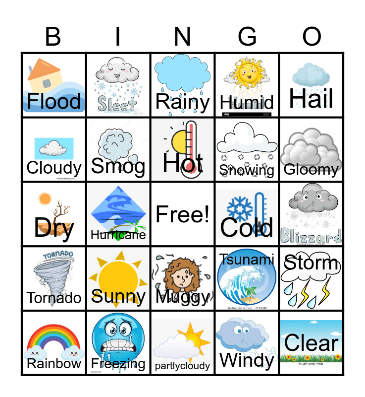 This bingo card has 24 images, a free space and 22 words: Sunny, Freezing, Hot, Rainbow, Hail, Flood, Cloudy, Cold, Muggy, Snowing, Dry, Tsunami, Storm, Smog, Windy, Rainy, Gloomy, Hurricane, Clear, Tornado, Humid and partlycloudy.