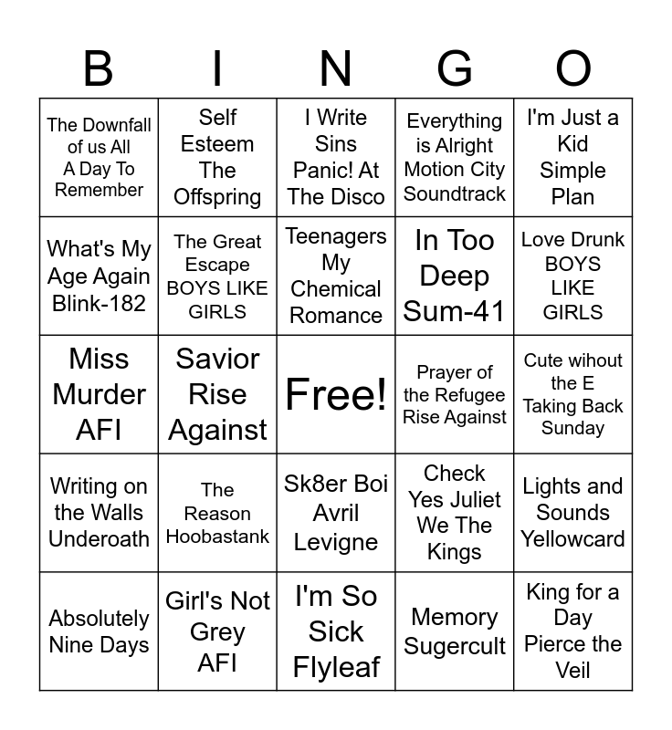 This bingo card has a free space and 75 words: This Ain't a Scene Fall Out Boy, The Anthem Good Charlotte, I Write Sins Panic! At The Disco, Misery Business Paramore, Fat Lip Sum 41, 1985 Bowling For Soup, The Middle Jimmy Eat World, Move Along All American Rejects, Ocean Avenue Yellowcard, Face Down Red Jumpsuit Apparatus, My Own Worst Enemy Lit, Dear Maria All Time Low, Teenagers My Chemical Romance, What's My Age Again Blink-182, Stacy's Mom Fountains of Wayne, Savior Rise Against, Mr. Brightside The Killers, King for a Day Pierce the Veil, The Taste of ink The Used, I'm Just a Kid Simple Plan, Ohio is for Lovers Hawthorne Heights, Miss Murder AFI, The Great Escape BOYS LIKE GIRLS, Self Esteem The Offspring, Everything is Alright Motion City Soundtrack, Can't Be Saved Senses Fail, Jamie All Over Mayday Parade, All That I've Got The Used, Situations Escape the Fate, Smile in your Sleep Silverstein, Dance, Dance Fall Out Boy, Dirty Little Secret All-American Rejects, Perfect Simple Plan, Check Yes Juliet We The Kings, Love Drunk BOYS LIKE GIRLS, In Too Deep Sum-41, I Miss You Blink-182, A Box Full of Sharp Objects The Used, Cute wihout the E Taking Back Sunday, Memory Sugercult, The Boys of Summer The Ataris, Until the Day I Die Story of the Year, Lifestyles/Rich and the Famous Good Charlotte, The Rock Show Blink-182, MakeDamnSure Taking Back Sunday, Welcome to the Black Parade My Chemical Romance, Absolutely Nine Days, The Downfall of us All A Day To Remember, Lying is the Fun a Girl Can Have Panic! At The Disco, If It Means A Lot To You A Day To Remember, Girl all the Bad Guys Want Bowling for Soup, Sk8er Boi Avril Levigne, The Kids Aren't Alright The Offspring, Since You Been Gone A Day To Remember, Basket Case Green Day, The Kill Thirty Seconds to Mars, Teenage Dirtbag Wheatus, Can You Feel My Heart Bring Me the Horizon, The Drug in Me is You Falling In Reverse, My Heroine Silverstein, The Reason Hoobastank, The Bird and the Worm The Used, My Friends Over You New Found Glory, All Downhill From Here New Found Glory, I'm Not Okay My Chemical Romance, Prayer of the Refugee Rise Against, Vindicated Dashboard Confessional, Be My Escape Relient K, That's What You Get Paramore, Lights and Sounds Yellowcard, Writing on the Walls Underoath, Girl's Not Grey AFI, I'm Not A Vampire Falling In Reverse, I'm So Sick Flyleaf and All Around Me Flyleaf.