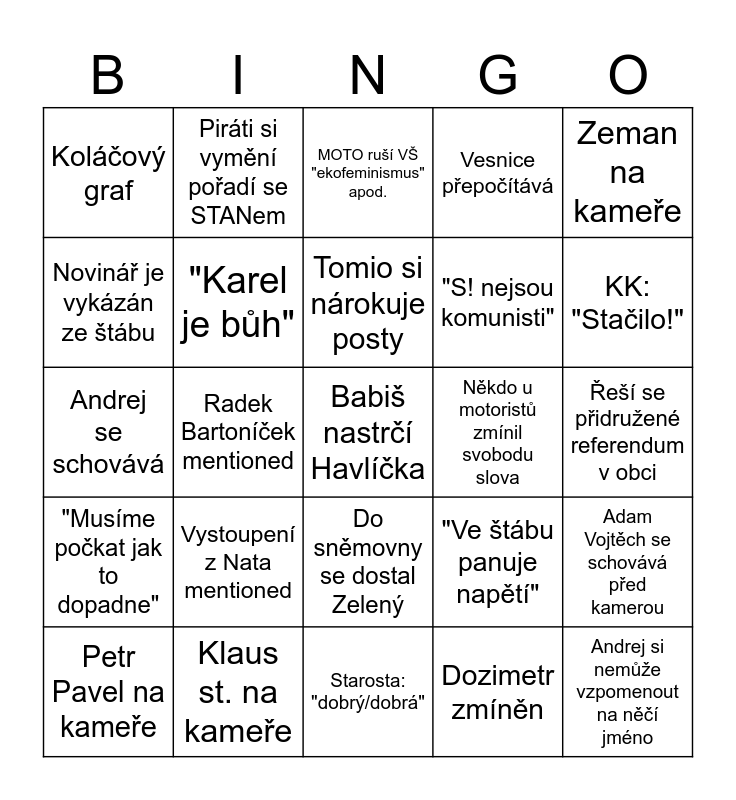 This bingo card has 50 words: Juchelka chválí andreje, Babiš nastrčí Havlíčka, Fiala: "slušně", Starosta: "dobrý/dobrá", Vystoupení z Nata mentioned, Vystoupení z EU mentioned, Piráti si vymění pořadí se STANem, Marcela projeví emoci, Novinář je vykázán ze štábu, Opilec ve volebním štábu, "Karel je bůh", Vesnice přepočítává, Adam Vojtěch se schovává před kamerou, "Ve štábu panuje napětí", "Budeme žít na dluh", Hřib je best bro s Ivanem, Tomio si nárokuje posty, Někdo u motoristů zmínil svobodu slova, S! nebo MOT se nedostali do sněmovny, Zeman na kameře, Radek Bartoníček mentioned, Dozimetr zmíněn, Koláčový graf, "S! nejsou komunisti", Nepřiznaná koalice se hádá, Andrej si nemůže vzpomenout na něčí jméno, KK: "Stačilo!", Vidlák mluví o zemědělství, MOTO ruší VŠ "ekofeminismus" apod., Do sněmovny se dostal Zelený, Řeší se dredy, Maláčová neodpovídá na otázku, Policie prošetřuje hlasy, Bomba ve volební místnosti, Klaus st. na kameře, Řeší se catering, Obec má 100% účast, Opilec obtěžuje volební komisi, Průměrná účast překročila 70%, Řeší se přidružené referendum v obci, Rezignace předsedy, ANO přesně na 30%, Hackeři napadli web, Kampelička zmíněna, Petr Pavel na kameře, Andrej se schovává, Reportáž s mobilní urnou, Tomáš Lebeda ve studiu, "Musíme počkat jak to dopadne" and Green Deal mentioned.