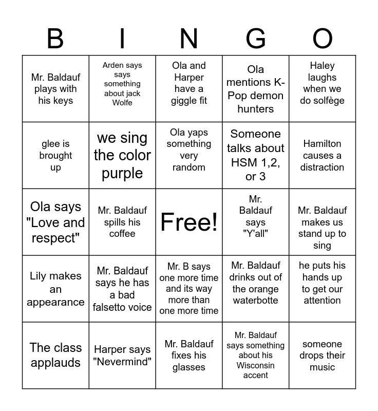 This bingo card has a free space and 24 words: Mr. Baldauf says he has a bad falsetto voice, Harper says "Nevermind", Ola yaps something very random, The class applauds, Haley laughs when we do solfège, Mr. Baldauf plays with his keys, glee is brought up, Arden says says something about jack Wolfe, Mr. Baldauf says "Y'all", Mr. B says one more time and its way more than one more time, Someone talks about HSM 1,2, or 3, Ola says "Love and respect", Mr. Baldauf drinks out of the orange waterbotte, he puts his hands up to get our attention, we sing the color purple, Mr. Baldauf says something about his Wisconsin accent, Mr. Baldauf makes us stand up to sing, Ola and Harper have a giggle fit, Hamilton causes a distraction, Mr. Baldauf spills his coffee, someone drops their music, Lily makes an appearance, Ola mentions K-Pop demon hunters and Mr. Baldauf fixes his glasses.