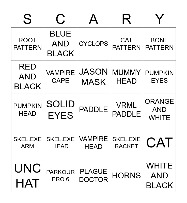 This bingo card has a free space and 24 words: SKEL.EXE HEAD, PARKOUR PRO 6, JASON MASK, UNC HAT, BONE PATTERN, ROOT PATTERN, RED AND BLACK, BLUE AND BLACK, VRML PADDLE, VAMPIRE HEAD, MUMMY HEAD, PUMPKIN HEAD, SKEL.EXE RACKET, CAT, VAMPIRE CAPE, HORNS, ORANGE AND WHITE, CYCLOPS, PUMPKIN EYES, SOLID EYES, WHITE AND BLACK, SKEL.EXE ARM, CAT PATTERN and PLAGUE DOCTOR.