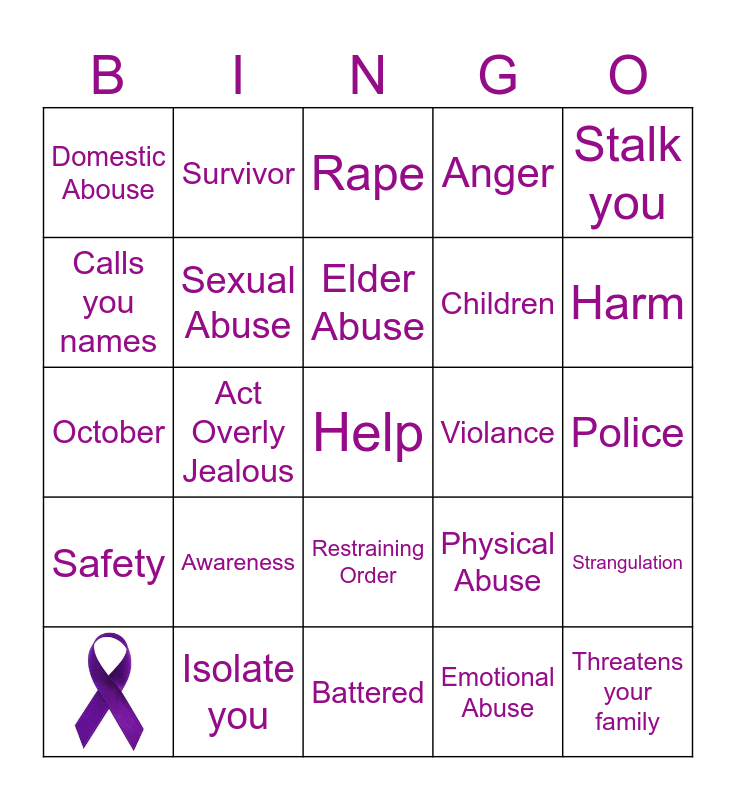 This bingo card has 1 images and 24 words: Awareness, Battered, Elder Abuse, Stalk you, Domestic Abouse, Calls you names, Survivor, Violance, Restraining Order, Children, October, Physical Abuse, Strangulation, Sexual Abuse, Threatens your family, Police, Rape, Harm, Act Overly Jealous, Help, Isolate you, Safety, Anger and Emotional Abuse.