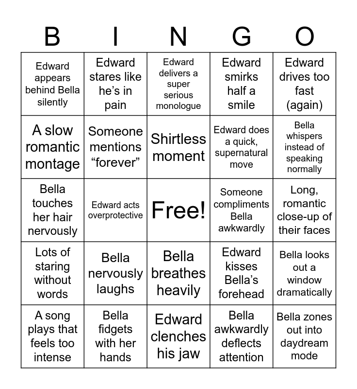 This bingo card has a free space and 35 words: Bella bites her lip, Edward broods silently, Awkward, lingering stare, Someone mentions “forever”, Bella breathes heavily, Edward smirks half a smile, A slow romantic montage, Bella trips, Shirtless moment, Bella looks uncomfortable in heels, Bella touches her hair nervously, Edward drives too fast (again), A character glares in the background, Bella says something sarcastic, Edward appears behind Bella silently, Someone compliments Bella awkwardly, Bella awkwardly deflects attention, Edward acts overprotective, Lots of staring without words, Bella zones out into daydream mode, Edward kisses Bella’s forehead, A song plays that feels too intense, Bella looks out a window dramatically, Bella fidgets with her hands, Edward delivers a super serious monologue, Bella whispers instead of speaking normally, Edward calls Bella by her full name, Someone gasps dramatically, Edward does a quick, supernatural move, Long, romantic close-up of their faces, Bella avoids eating something, Edward clenches his jaw, Bella nervously laughs, Edward stares like he’s in pain and Bella gets overwhelmed and says “Stop!” or “Wait!”.