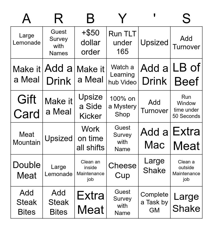 This bingo card has 36 words: Cheese Cup, Clean an inside Maintenance job, Guest Survey with Name, Make it a Meal, Meat Mountain, 100% on a Mystery Shop, Add a Drink, Extra Meat, Upsized, Large Shake, LB of Beef, Run TLT under 165, Clean a outside Maintenance job, Make it a Meal, Watch a Learning hub Video, Large Lemonade, Double Meat, Add Turnover, Gift Card, +$50 dollar order, Upsize a Side Kicker, Upsized, Guest Survey with Name, Work on time all shifts, Add a Mac, Guest Survey with Names, Add a Drink, Add Steak Bites, Make it a Meal, Add Turnover, Large Shake, Add Steak Bites, Extra Meat, Run Window time under 50 Seconds, Large Lemonade and Complete a Task by GM.