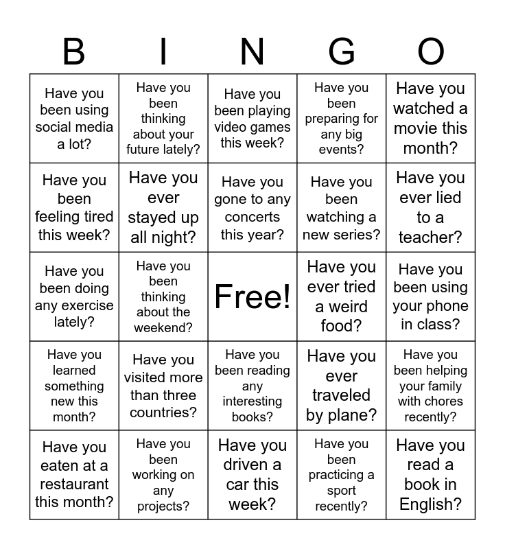 This bingo card has a free space and 29 words: Have you eaten at a restaurant this month?, Have you been talking to a friend a lot lately?, Have you been thinking about the weekend?, Have you cleaned your room this week?, Have you been using social media a lot?, Have you been playing video games this week?, Have you ever stayed up all night?, Have you visited more than three countries?, Have you ever tried a weird food?, Have you been working on any projects?, Have you been using your phone in class?, Have you read a book in English?, Have you driven a car this week?, Have you been practicing a sport recently?, Have you ever lied to a teacher?, Have you been learning any new hobbies?, Have you been reading any interesting books?, Have you learned something new this month?, Have you watched a movie this month?, Have you been doing any exercise lately?, Have you ever traveled by plane?, Have you ever given a speech?, Have you been watching a new series?, Have you been feeling tired this week?, Have you been preparing for any big events?, Have you been thinking about your future lately?, Have you been helping your family with chores recently?, Have you gone to any concerts this year? and Have you visited a museum this year?.