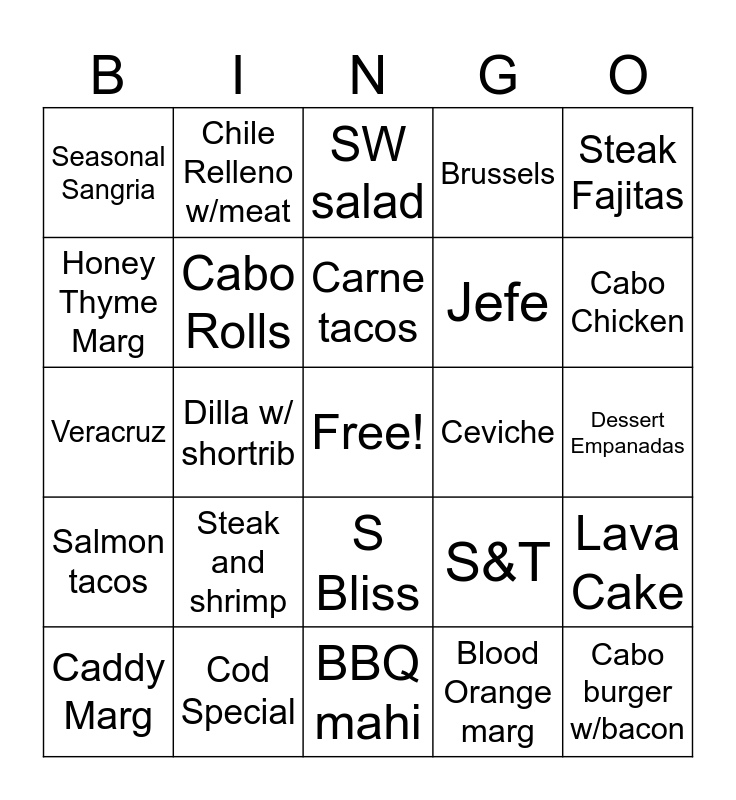 This bingo card has a free space and 24 words: Steak and shrimp, Cod Special, Carne tacos, Caddy Marg, Steak Fajitas, Seasonal Sangria, Honey Thyme Marg, Chile Relleno w/meat, Ceviche, S Bliss, Jefe, Veracruz, S&T, Lava Cake, Cabo Rolls, Blood Orange marg, Dessert Empanadas, SW salad, Cabo Chicken, Dilla w/ shortrib, Cabo burger w/bacon, Salmon tacos, Brussels and BBQ mahi.