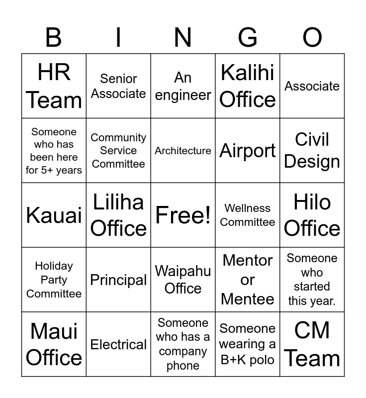 This bingo card has a free space and 24 words: Principal, Electrical, Architecture, Maui Office, Associate, HR Team, Someone who has been here for 5+ years, Senior Associate, Wellness Committee, Waipahu Office, Airport, Kauai, Mentor or Mentee, Someone who started this year., Community Service Committee, Someone wearing a B+K polo, Hilo Office, An engineer, Civil Design, Liliha Office, CM Team, Holiday Party Committee, Kalihi Office and Someone who has a company phone.