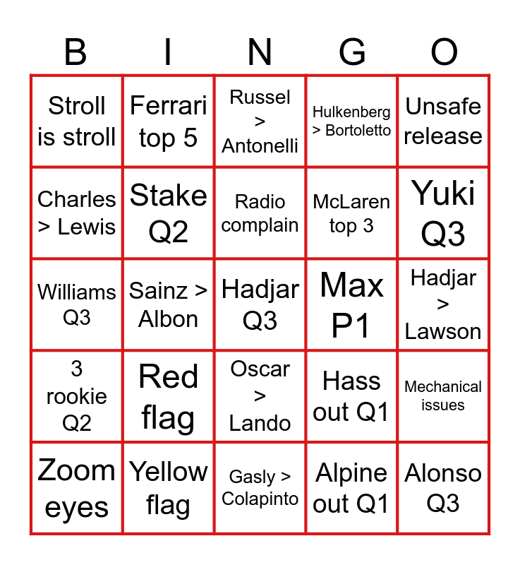 This bingo card has a free space and 24 words: Red flag, Yellow flag, Radio complain, Zoom eyes, Unsafe release, Stroll is stroll, Charles > Lewis, Ferrari top 5, Max P1, Oscar > Lando, McLaren top 3, Williams Q3, Hass out Q1, Mechanical issues, Stake Q2, Alpine out Q1, Hadjar > Lawson, Russel > Antonelli, Yuki Q3, Sainz > Albon, Alonso Q3, 3 rookie Q2, Hulkenberg > Bortoletto and Gasly > Colapinto.