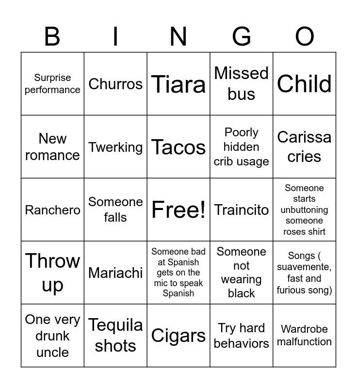 This bingo card has a free space and 24 words: Mariachi, Tequila shots, Tacos, One very drunk uncle, Child, Surprise performance, New romance, Churros, Traincito, Someone bad at Spanish gets on the mic to speak Spanish, Poorly hidden crib usage, Ranchero, Someone not wearing black, Songs ( suavemente, fast and furious song), Twerking, Try hard behaviors, Someone starts unbuttoning someone roses shirt, Tiara, Carissa cries, Someone falls, Wardrobe malfunction, Throw up, Missed bus and Cigars.