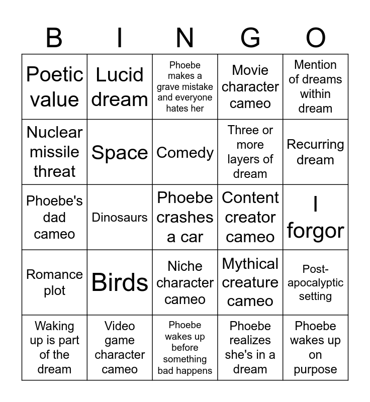 This bingo card has 43 words: Phoebe dies, Phoebe crashes a car, Prophetic vision, Waking up is part of the dream, Infinite nightmare dimension, Phoebe realizes she's in a dream, Phoebe makes a grave mistake and everyone hates her, Phoebe wakes up before something good happens, Mention of dreams within dream, Video game character cameo, Movie character cameo, Content creator cameo, Niche character cameo, Birds, Event that warrants mentioning to therapist, Phoebe wakes up before something bad happens, Friend cameo, Phoebe's dad cameo, Genuine Nightmare, Recurring dream, Lucid dream, Nightmare that isn't scary, Dream that shouldn't be scary but is, Poetic value, Absurd circumstance, I forgor, Horror movie, Whatever Phoebe was doing last, Mythical creature cameo, Romance plot, Cool worldbuilding, Post-apocalyptic setting, Fantasy setting, Dinosaurs, Deja vu, suddenly blind, Phoebe wakes up on purpose, Comedy, Nuclear missile threat, Three or more layers of dream, Historical figure cameo, Space and Sudden atmosphere shift.