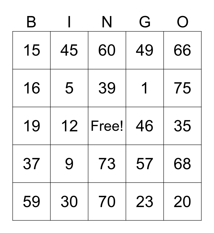 This bingo card has a free space and 24 words: 9, 30, 39, 59, 66, 15, 16, 45, 46, 73, 1, 19, 57, 68, 5, 23, 35, 60, 75, 12, 20, 37, 49 and 70.