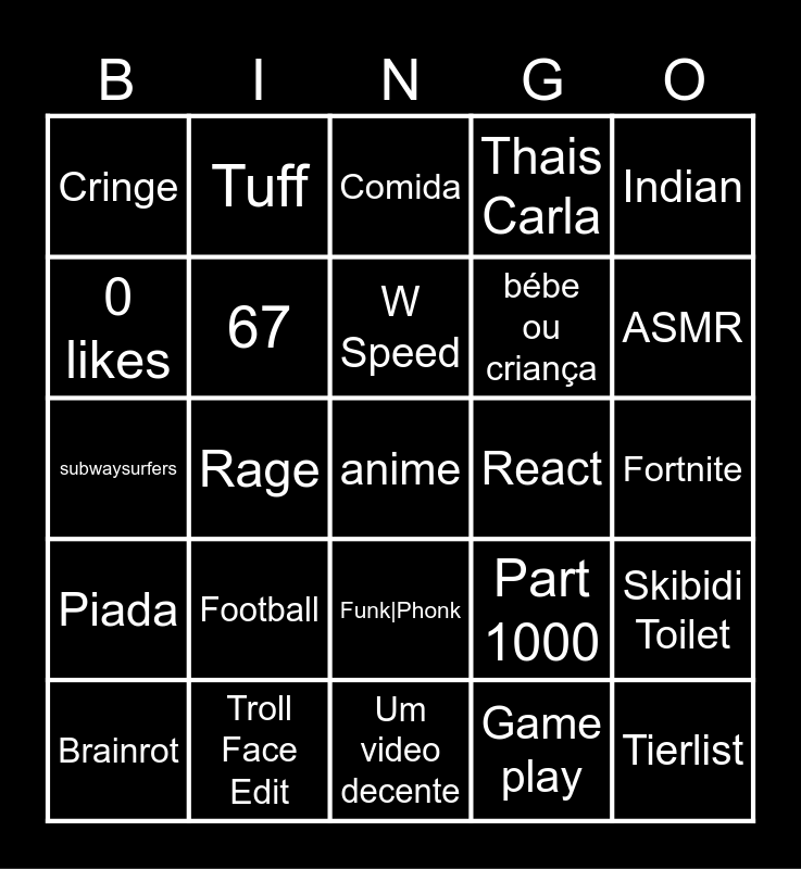 This bingo card has a free space and 24 words: Football, Troll Face Edit, W Speed, Brainrot, Indian, Cringe, 0 likes, Tuff, React, Funk|Phonk, bébe ou criança, subwaysurfers, Part 1000, Skibidi Toilet, 67, Game play, Fortnite, Comida, ASMR, Rage, Tierlist, Piada, Thais Carla and Um video decente.