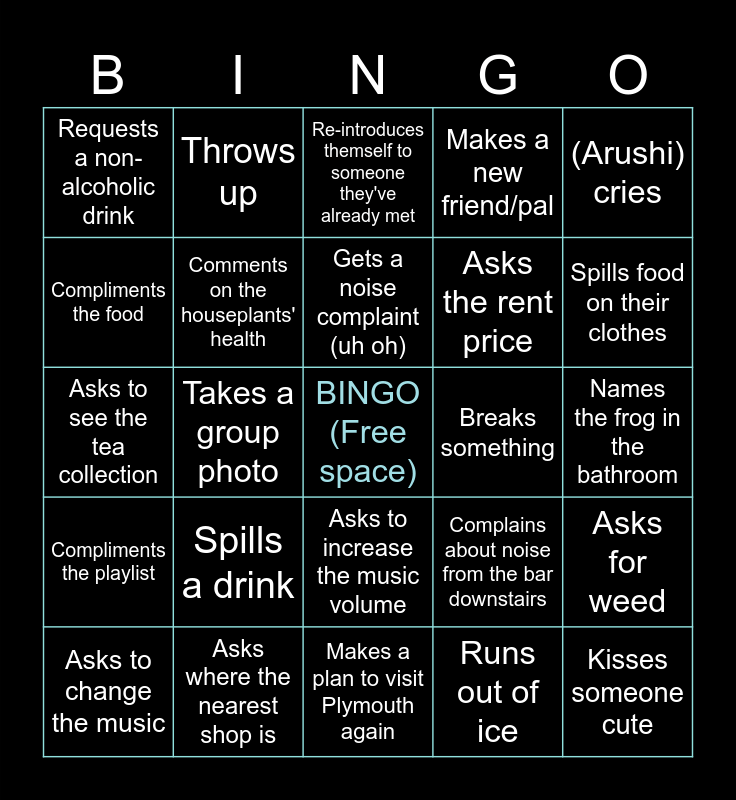 This bingo card has a free space and 24 words: Spills a drink, Asks where the nearest shop is, Gets a noise complaint (uh oh), Asks to change the music, (Arushi) cries, Requests a non-alcoholic drink, Compliments the food, Throws up, Breaks something, Asks to increase the music volume, Asks the rent price, Asks to see the tea collection, Complains about noise from the bar downstairs, Asks for weed, Comments on the houseplants' health, Runs out of ice, Names the frog in the bathroom, Re-introduces themself to someone they've already met, Spills food on their clothes, Takes a group photo, Kisses someone cute, Compliments the playlist, Makes a new friend/pal and Makes a plan to visit Plymouth again.