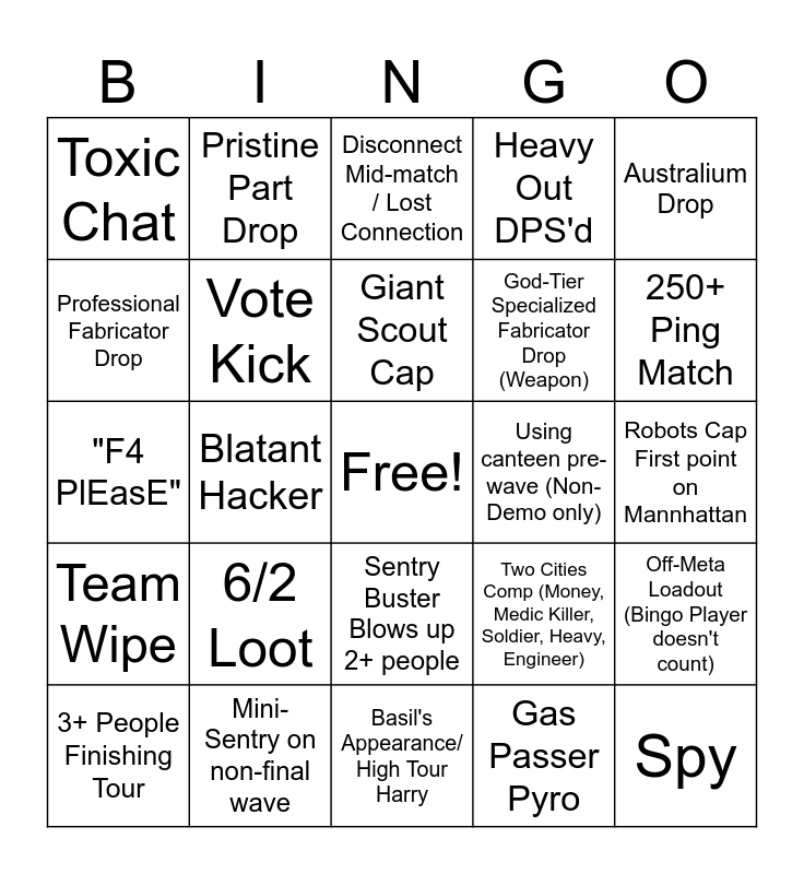 This bingo card has a free space and 24 words: 6/2 Loot, Mini-Sentry on non-final wave, Giant Scout Cap, 3+ People Finishing Tour, Australium Drop, Toxic Chat, Professional Fabricator Drop, Pristine Part Drop, Using canteen pre-wave (Non-Demo only), Sentry Buster Blows up 2+ people, God-Tier Specialized Fabricator Drop (Weapon), "F4 PlEasE", Two Cities Comp (Money, Medic Killer, Soldier, Heavy, Engineer), Off-Meta Loadout (Bingo Player doesn't count), Vote Kick, Gas Passer Pyro, Robots Cap First point on Mannhattan, Disconnect Mid-match / Lost Connection, 250+ Ping Match, Blatant Hacker, Spy, Team Wipe, Heavy Out DPS'd and Basil's Appearance/ High Tour Harry.