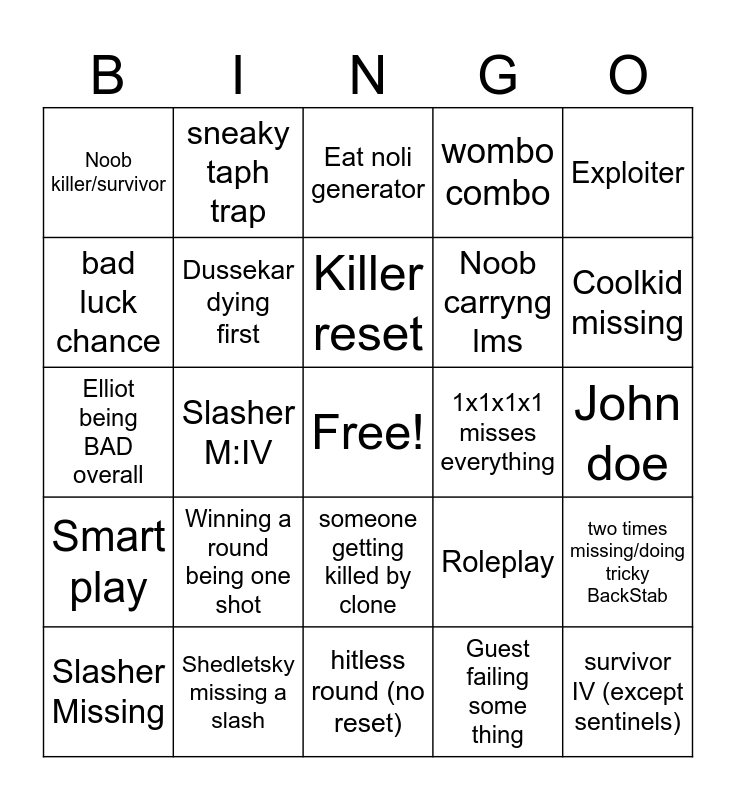 This bingo card has a free space and 24 words: Winning a round being one shot, Shedletsky missing a slash, Killer reset, Slasher Missing, Exploiter, Noob killer/survivor, bad luck chance, sneaky taph trap, 1x1x1x1 misses everything, someone getting killed by clone, Noob carryng lms, Elliot being BAD overall, Roleplay, two times missing/doing tricky BackStab, Dussekar dying first, Guest failing some thing, John doe, Eat noli generator, Coolkid missing, Slasher M:IV, survivor IV (except sentinels), Smart play, wombo combo and hitless round (no reset).