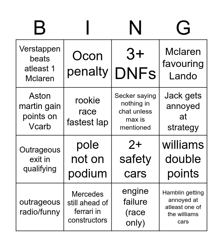 This bingo card has 16 words: Mercedes still ahead of ferrari in constructors, williams double points, 3+ DNFs, Verstappen beats atleast 1 Mclaren, Outrageous exit in qualifying, Ocon penalty, 2+ safety cars, engine failure (race only), Aston martin gain points on Vcarb, rookie race fastest lap, outrageous radio/funny, Mclaren favouring Lando, pole not on podium, Jack gets annoyed at strategy, Secker saying nothing in chat unless max is mentioned and Hamblin getting annoyed at atleast one of the williams cars.