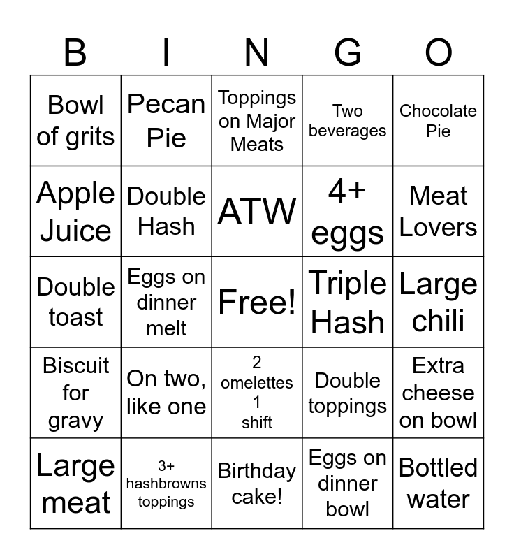 This bingo card has a free space and 24 words: On two, like one, 3+ hashbrowns toppings, ATW, Large meat, Chocolate Pie, Bowl of grits, Apple Juice, Pecan Pie, Triple Hash, 2 omelettes 1 shift, 4+ eggs, Double toast, Double toppings, Extra cheese on bowl, Double Hash, Eggs on dinner bowl, Large chili, Toppings on Major Meats, Meat Lovers, Eggs on dinner melt, Bottled water, Biscuit for gravy, Two beverages and Birthday cake!.