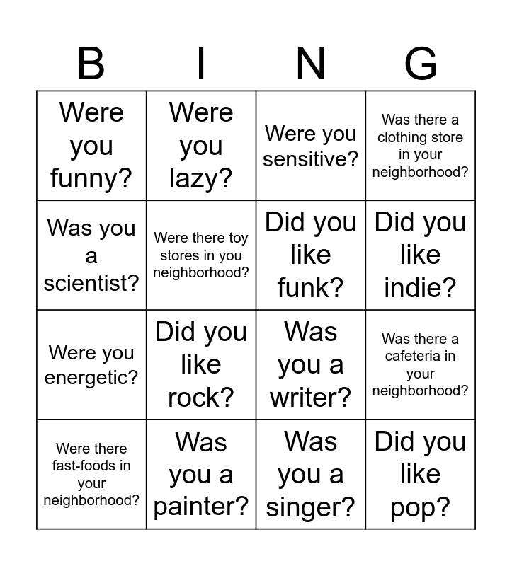 This bingo card has 16 words: Was you a painter?, Was there a cafeteria in your neighborhood?, Were you sensitive?, Were you funny?, Were you energetic?, Were you lazy?, Was you a writer?, Was you a singer?, Was you a scientist?, Were there toy stores in you neighborhood?, Were there fast-foods in your neighborhood?, Was there a clothing store in your neighborhood?, Did you like rock?, Did you like indie?, Did you like funk? and Did you like pop?.