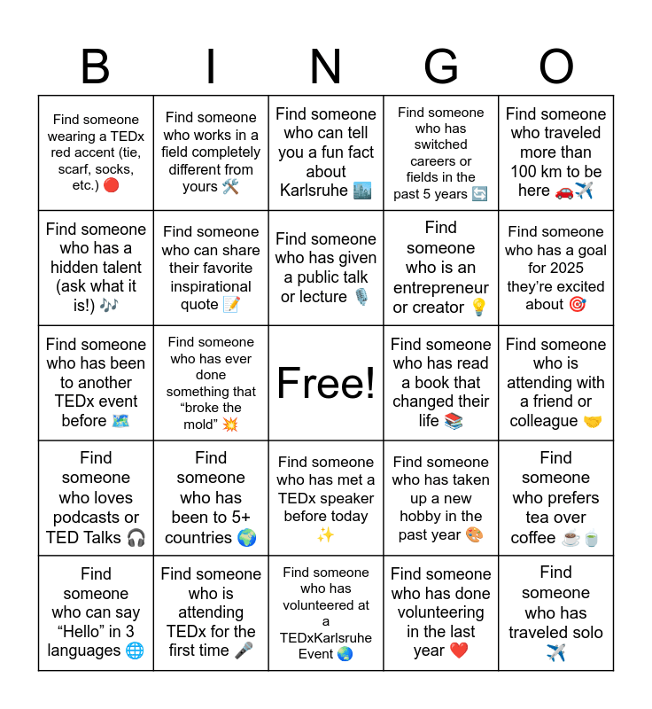 This bingo card has a free space and 24 words: Find someone who has been to 5+ countries π, Find someone who is attending TEDx for the first time π€, Find someone who has given a public talk or lecture ποΈ, Find someone who can say βHelloβ in 3 languages π, Find someone who traveled more than 100 km to be here πβοΈ, Find someone wearing a TEDx red accent (tie, scarf, socks, etc.) π΄, Find someone who has a hidden talent (ask what it is!) πΆ, Find someone who works in a field completely different from yours π οΈ, Find someone who has read a book that changed their life π, Find someone who has met a TEDx speaker before today β¨, Find someone who is an entrepreneur or creator π‘, Find someone who has been to another TEDx event before πΊοΈ, Find someone who has taken up a new hobby in the past year π¨, Find someone who prefers tea over coffee βπ΅, Find someone who can share their favorite inspirational quote π, Find someone who has done volunteering in the last year β€οΈ, Find someone who is attending with a friend or colleague π€, Find someone who can tell you a fun fact about Karlsruhe ποΈ, Find someone who has a goal for 2025 theyβre excited about π―, Find someone who has ever done something that βbroke the moldβ π₯, Find someone who has traveled solo βοΈ, Find someone who loves podcasts or TED Talks π§, Find someone who has switched careers or fields in the past 5 years π and Find someone who has volunteered at a TEDxKarlsruhe Event π.