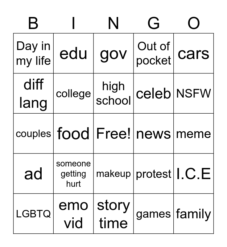 This bingo card has a free space and 24 words: LGBTQ, someone getting hurt, high school, games, cars, Day in my life, edu, gov, news, meme, couples, college, protest, I.C.E, diff lang, emo vid, story time, Out of pocket, NSFW, ad, food, makeup, celeb and family.