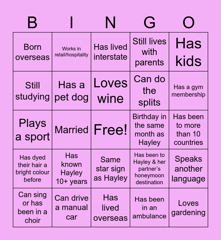 This bingo card has a free space and 81 words: Has a tattoo, Went on holiday with Hayley, Has lived interstate, Has more than one piercing, Works with children, Has a passport that’s expired, Has siblings, Is in the bridal party, Loves chocolate, Can whistle loudly with fingers, Has been skydiving or bungee jumping, Is related to Hayley, Still lives with parents, Born overseas, Has run a marathon/half marathon, Still studying, Lives alone, Has known Hayley 10+ years, Has met someone famous, Has been to more than 10 countries, Is a twin, Has kids, Plays a sport, Loves wine, Has a pet dog, Knows Hayley from school, Enjoys cooking, Is crafty/arty, Works in IT/tech, Collects something, Has a gym membership, Works in education, Has lived overseas, Has stepchildren, Can sing or has been in a choir, Birthday in the same month as Hayley, Has been on a cruise, Has godchildren, Has broken a bone, Is left-handed, Loves gardening, Has been backpacking, Has never been on a plane, Has ridden a horse, Married, Loves coffee, Works in retail/hospitality, Has been on a camping trip, Is self-employed, Engaged, Has been to Hayley & her partner’s honeymoon destination, Speaks another language, Born in the same town as Hayley, Works in healthcare, Single, Has changed careers, Has done a road trip longer than 10 hours, Has a pet cat, Is allergic to something, Has visited more than one continent, Same star sign as Hayley, Works with animals, Has more than three siblings, Has been bridesmaid before, Lives in Drouin, Doesn’t drink alcohol, Loves reading, Has travelled for work, Is an only child, Works in finance, Lives in Ballarat, Has dyed their hair a bright colour before, Can drive a manual car, Has had braces, Owns more than 20 pairs of shoes, Has been to a music festival, Has a fear of heights, Has been in an ambulance, Knows how to sew or knit, Can do the splits and Has been scuba diving or snorkelling.