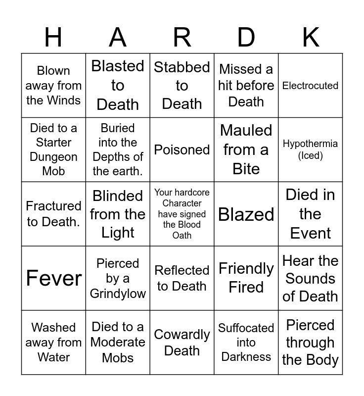 This bingo card has a free space and 24 words: Pierced by a Grindylow, Died to a Moderate Mobs, Poisoned, Washed away from Water, Electrocuted, Blown away from the Winds, Died to a Starter Dungeon Mob, Blasted to Death, Blazed, Reflected to Death, Mauled from a Bite, Fractured to Death., Friendly Fired, Hear the Sounds of Death, Buried into the Depths of the earth., Suffocated into Darkness, Died in the Event, Stabbed to Death, Hypothermia (Iced), Blinded from the Light, Pierced through the Body, Fever, Missed a hit before Death and Cowardly Death.