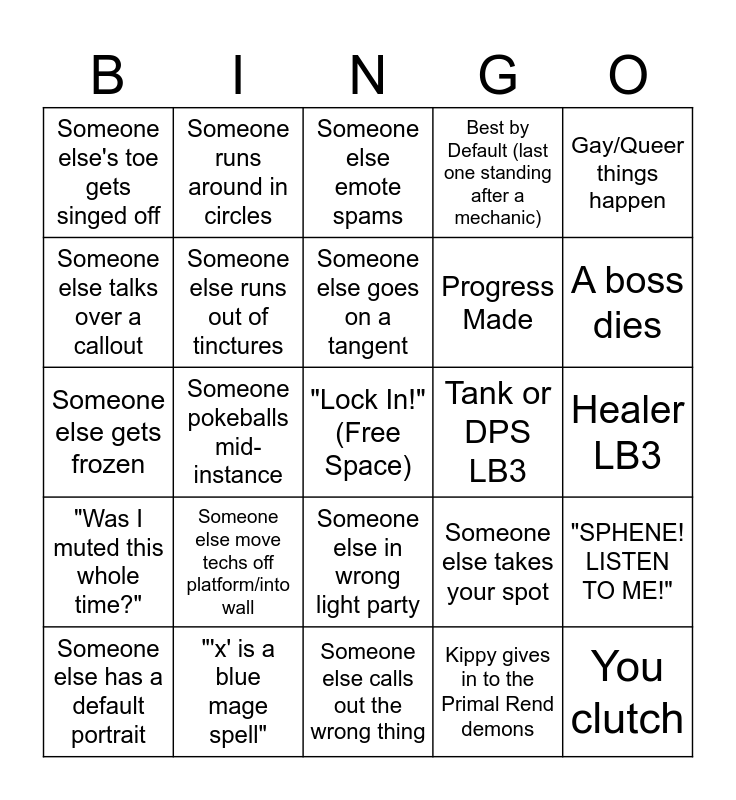 This bingo card has a free space and 39 words: We start on time, Someone else's gear breaks, Someone else forgets food buff for a pull, Someone else runs out of tinctures, Someone else has a default portrait, Someone else in wrong light party, Someone else goes on a tangent, Degeneracy Happens, Gay/Queer things happen, "Was I muted this whole time?", Someone pokeballs mid-instance, Best by Default (last one standing after a mechanic), You clutch, Healer LB3, Tank or DPS LB3, Someone else move techs off platform/into wall, Someone else kills you, Someone else's toe gets singed off, Someone else accidentally or early pulls, Someone else takes your spot, Someone else talks over a callout, Someone else calls out the wrong thing, Progress Made, A boss dies, Someone else mentions Majong, Someone else mentions Yakuza, Someone else mentions Sonic (Including music), Someone else mentions furry things, Someone else mentions Deltarune, Someone runs around in circles, Someone else crafts during break, Someone else ability spams (out of combat), Someone else emote spams, "'x' is a blue mage spell", Kippy gives in to the Primal Rend demons, Excog edging, "SPHENE! LISTEN TO ME!", Someone else gets frozen and Sphene snipes you from behind a rock (somehow).