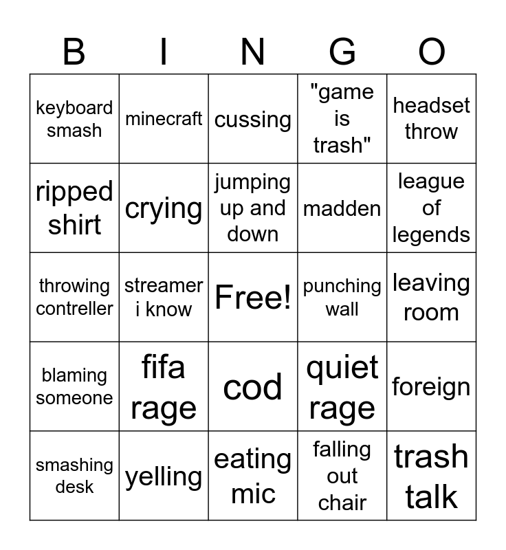 This bingo card has a free space and 24 words: fifa rage, yelling, jumping up and down, smashing desk, headset throw, keyboard smash, ripped shirt, minecraft, punching wall, cod, madden, throwing contreller, quiet rage, foreign, crying, falling out chair, leaving room, cussing, league of legends, streamer i know, trash talk, blaming someone, "game is trash" and eating mic.