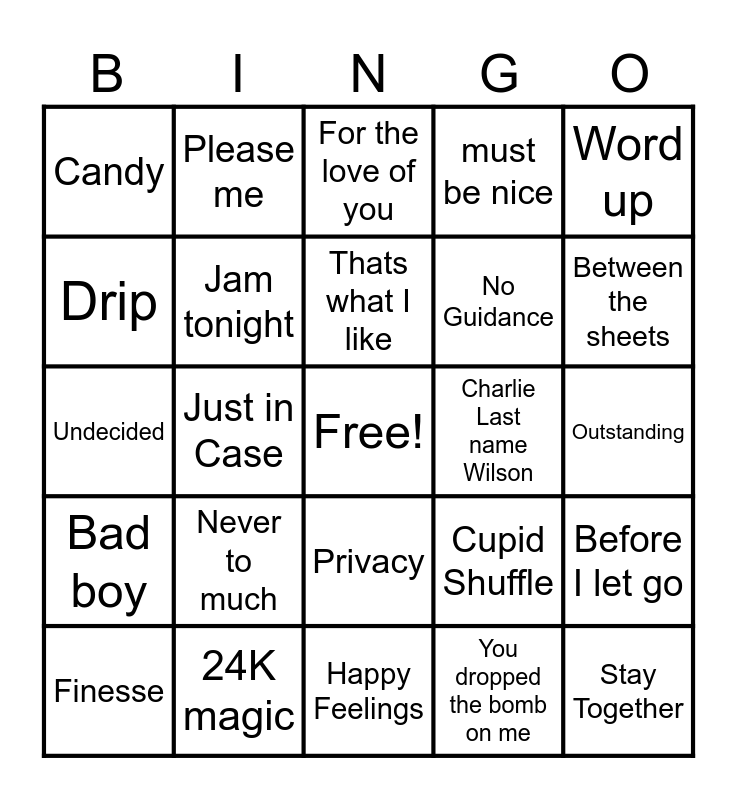 This bingo card has a free space and 24 words: Never to much, 24K magic, Thats what I like, Finesse, Word up, Candy, Drip, Please me, Charlie Last name Wilson, Privacy, No Guidance, Undecided, Cupid Shuffle, Before I let go, Jam tonight, You dropped the bomb on me, Outstanding, For the love of you, Between the sheets, Just in Case, Stay Together, Bad boy, must be nice and Happy Feelings.