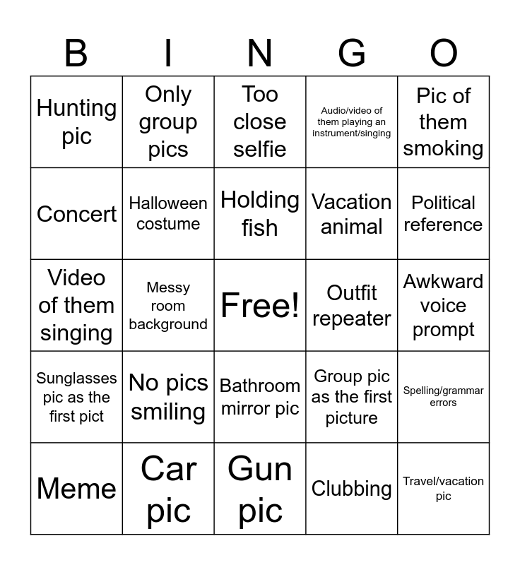 This bingo card has a free space and 49 words: Hat fishing, Travel/vacation pic, Graduation pic, Gun pic, No pics smiling, Snapchat filter/face filter, Only group pics, Drip pic, Concert, Cat, Halloween costume, Audio/video of them playing an instrument/singing, Spelling/grammar errors, Group pic as the first picture, Colored hair, Dad or brother, Holding fish, Outfit repeater, Sister or ex, Pic of them smoking, Messy room background, Clubbing, Hunting pic, Vacation animal, Food pic, Political reference, Meme, Pic older than 5 years, Bathroom mirror pic, Sunglasses pic as the first pict, Kid that isn’t theirs, Sports ball pic, Baby/kid pic (of themselves), Festival pic, Car pic, Shirtless pic, Instrument pic, Gym mirror, Awkward voice prompt, Mullet, Bed selfie, No prompts/only pictures, Pedostash, On a boat, Video of them singing, Too close selfie, Gas station mirror pic, Dog and Mom or sister.