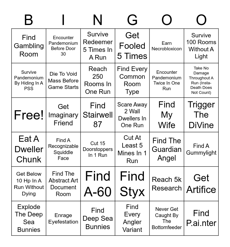 This bingo card has 36 words: Find Styx, Find A-60, Find Every Angler Variant, Survive Pandemonium By Hiding In A PSS, Eat A Dweller Chunk, Scare Away 2 Wall Dwellers In One Run, Die To Void Mass Before Game Starts, Find Deep Sea Bunnies, Earn Necrobloxicon, Reach 5k Research, Take No Damage Throughout A Run (Insta-Death Does Not Count), Get Fooled 5 Times, Get Artifice, Get Imaginary Friend, Find Every Common Room Type, Find Gambling Room, Get Below 10 Hp In A Run Without Dying, Find My Wife, Free!, Survive Redeemer 5 Times In A Run, Find Stairwell 87, Find A Recognizable Squiddle Face, Cut At Least 5 Mines In 1 Run, Cut 15 Doorstoppers In 1 Run, Find The Guardian Angel, Encounter Pandemonium Before Door 30, Encounter Pandemonium Twice In One Run, Enrage Eyefestation, Reach 250 Rooms In One Run, Survive 100 Rooms Without A Light, Find P.ai.nter, Explode The Deep Sea Bunnies, Find A Gummylight, Trigger The DiVine, Find The Abstract Art Document Room and Never Get Caught By The Bottomfeeder.