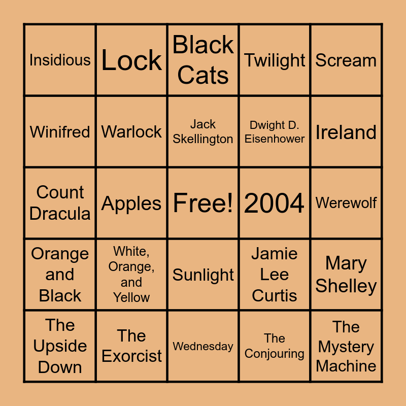 This bingo card has a free space and 50 words: Coven, The Mystery Machine, Michael Jackson, Wednesday, White, Orange, and Yellow, Freddy Krueger, Lock, Oogie Boogie, Winifred, Interview with the Vampire, Warlock, Twilight, Mary Shelley, Jamie Lee Curtis, Jason Voorhees, Romania, Jack Skellington, 2004, The Overlook Hotel, Scream, Apples, The Conjouring, Insidious, Dwight D. Eisenhower, October 31st, Turnips, Ireland, All Hallows' Eve, Black Cats, Sunlight, Snickers, Pamela Voorhees, Camp Crystal Lake, The Shining, The Exorcist, Chucky, Alfred Hitchcock, Broomsticks, Vampire, Werewolf, Scare Away Spirits, Remus Lupin, Pennywise, Casper, The Upside Down, Count Dracula, Johnny Depp, Garlic, Orange and Black and Arachnophobia.