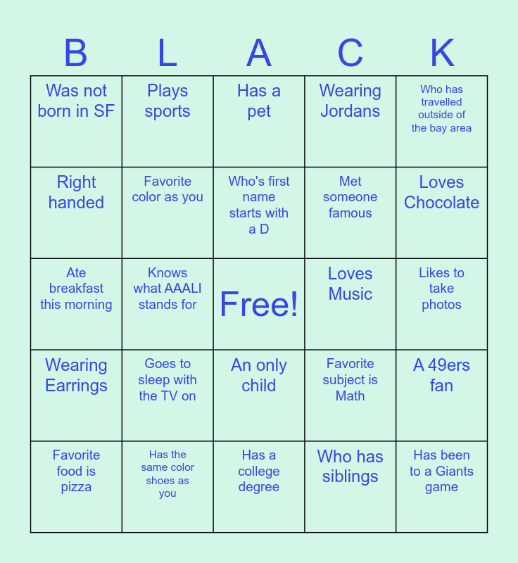 This bingo card has a free space and 24 words: Goes to sleep with the TV on, Has the same color shoes as you, Who's first name starts with a D, Favorite food is pizza, Who has travelled outside of the bay area, Was not born in SF, Right handed, Plays sports, Loves Music, An only child, Met someone famous, Ate breakfast this morning, Favorite subject is Math, A 49ers fan, Favorite color as you, Who has siblings, Likes to take photos, Has a pet, Loves Chocolate, Knows what AAALI stands for, Has been to a Giants game, Wearing Earrings, Wearing Jordans and Has a college degree.