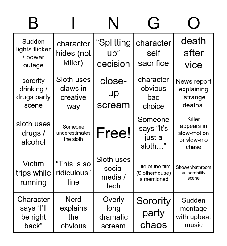 This bingo card has a free space and 30 words: Nerd explains the obvious, Sorority mean girl insult, Someone underestimates the sloth, Killer POV shot, Sudden lights flicker / power outage, “Splitting up” decision, Sloth uses claws in creative way, Sloth uses social media / tech, Someone says “It’s just a sloth…”, Overly long dramatic scream, Killer appears in slow-motion or slow-mo chase, Sudden montage with upbeat music, Sorority party chaos, Phone dies at the worst possible time, News report explaining “strange deaths”, Cop or authority figure is useless, Title of the film (Slotherhouse) is mentioned, Victim trips while running, “This is so ridiculous” line, death after vice, sloth uses drugs / alcohol, Weapon conveniently lying around, character hides (not killer), character obvious bad choice, sorority drinking / drugs party scene, character self sacrifice, Shower/bathroom vulnerability scene, Character says “I’ll be right back”, close-up scream and sloth kills with human weapon.