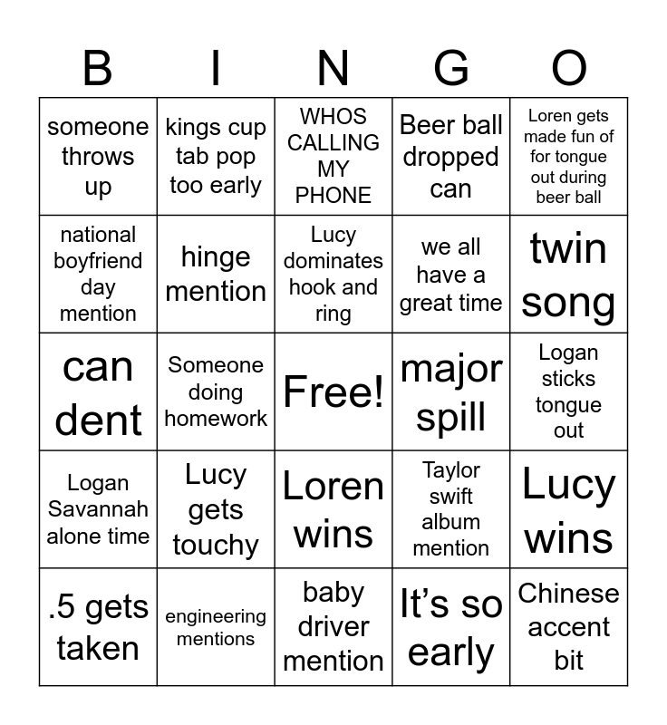 This bingo card has a free space and 29 words: .5 gets taken, “Who said a blank can’t blank”, Someone doing homework, predictions list cross off, someone throws up, WHOS CALLING MY PHONE, hinge mention, Lucy gets touchy, major spill, engineering mentions, Logan sticks tongue out, Chinese accent bit, baby driver mention, It’s so early, twin song, someone has to pee while zip tied, Loren wins, Logan Savannah alone time, Loren gets made fun of for tongue out during beer ball, can dent, Taylor swift album mention, diet pepsi, we all have a great time, national boyfriend day mention, Beer ball dropped can, kings cup tab pop too early, Lucy wins, Lucy dominates hook and ring and Lucy pees pants // complains.