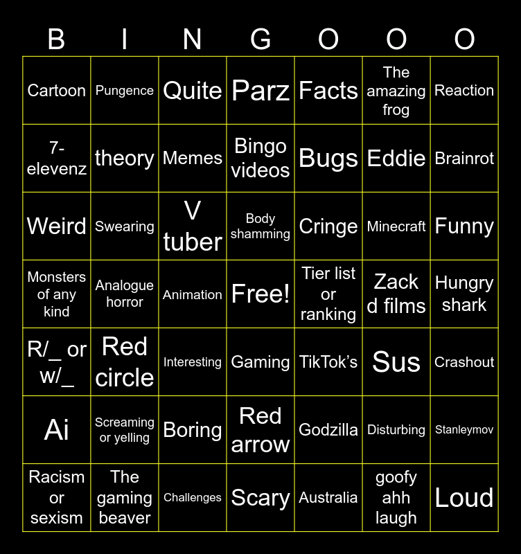 This bingo card has a free space and 48 words: Godzilla, Eddie, Scary, Analogue horror, V tuber, Hungry shark, Pungence, The gaming beaver, The amazing frog, Gaming, Reaction, Parz, Minecraft, Cringe, Ai, Zack d films, 7-elevenz, Brainrot, Disturbing, Facts, Bugs, Animation, Cartoon, theory, Stanleymov, Memes, Funny, Racism or sexism, Body shamming, Swearing, goofy ahh laugh, Tier list or ranking, Crashout, Screaming or yelling, Monsters of any kind, TikTok’s, Sus, Weird, Interesting, Boring, R/_ or w/_, Loud, Quite, Challenges, Bingo videos, Red arrow, Red circle and Australia.