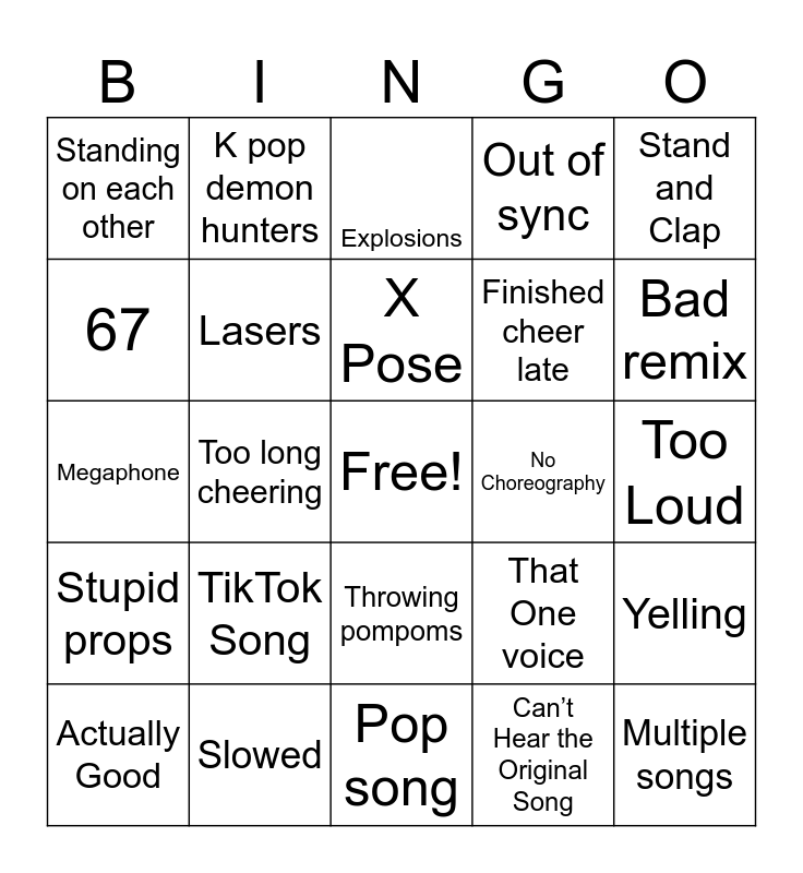 This bingo card has a free space and 24 words: Actually Good, TikTok Song, X Pose, Can’t Hear the Original Song, Stand and Clap, Standing on each other, K pop demon hunters, Explosions, No Choreography, Too Loud, Megaphone, Lasers, That One voice, Yelling, 67, Slowed, Pop song, Out of sync, Bad remix, Stupid props, Too long cheering, Throwing pompoms, Finished cheer late and Multiple songs.