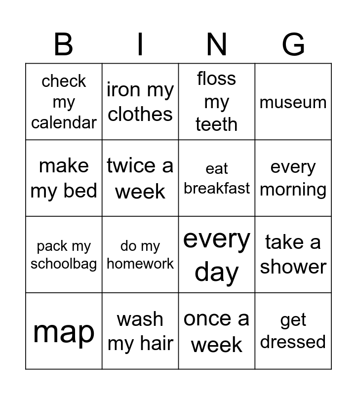This bingo card has 16 words: wash my hair, take a shower, floss my teeth, check my calendar, pack my schoolbag, iron my clothes, every day, once a week, make my bed, twice a week, map, museum, do my homework, every morning, eat breakfast and get dressed.