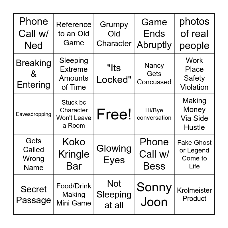 This bingo card has a free space and 24 words: Koko Kringle Bar, Food/Drink Making Mini Game, "Its Locked", Secret Passage, photos of real people, Phone Call w/ Ned, Breaking & Entering, Reference to an Old Game, Hi/Bye conversation, Glowing Eyes, Nancy Gets Concussed, Eavesdropping, Phone Call w/ Bess, Fake Ghost or Legend Come to Life, Sleeping Extreme Amounts of Time, Sonny Joon, Making Money Via Side Hustle, Grumpy Old Character, Work Place Safety Violation, Stuck bc Character Won't Leave a Room, Krolmeister Product, Gets Called Wrong Name, Game Ends Abruptly and Not Sleeping at all.