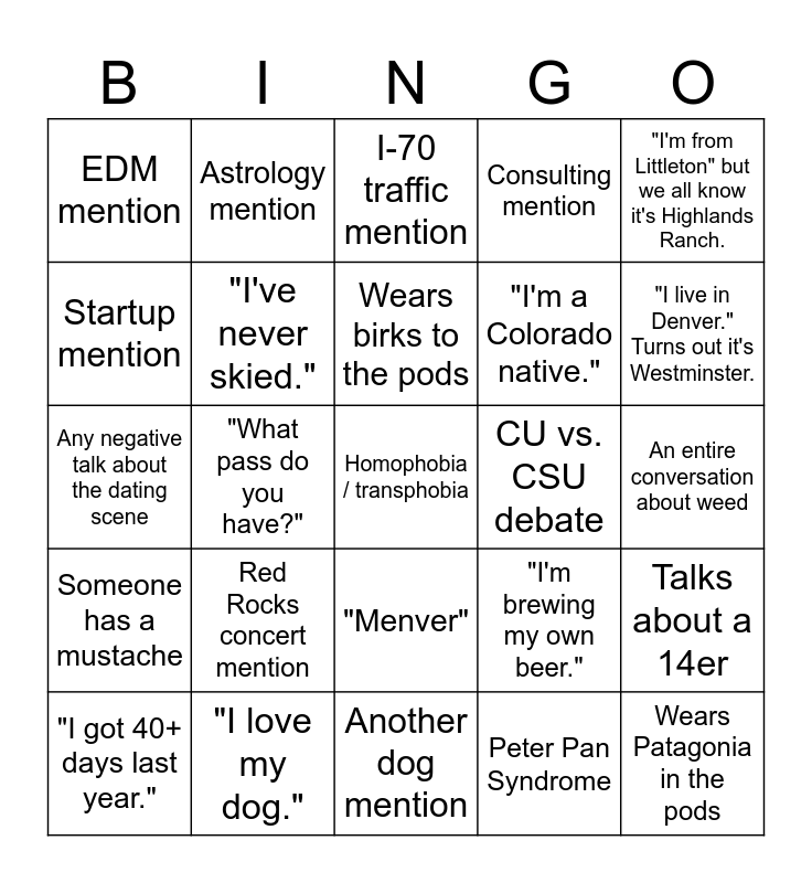 This bingo card has a free space and 24 words: Red Rocks concert mention, "I love my dog.", Wears birks to the pods, "I got 40+ days last year.", "I'm from Littleton" but we all know it's Highlands Ranch., EDM mention, Startup mention, Astrology mention, CU vs. CSU debate, "Menver", "I'm a Colorado native.", Any negative talk about the dating scene, "I'm brewing my own beer.", Talks about a 14er, "I've never skied.", Peter Pan Syndrome, An entire conversation about weed, I-70 traffic mention, "I live in Denver." Turns out it's Westminster., "What pass do you have?", Wears Patagonia in the pods, Someone has a mustache, Consulting mention and Another dog mention.