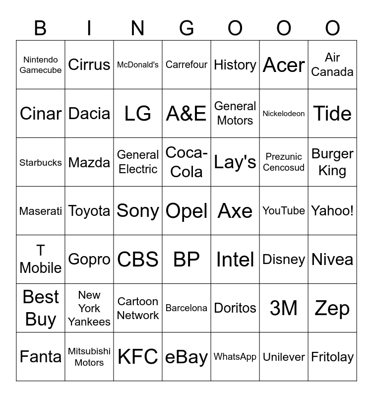 This bingo card has a free space and 48 words: Doritos, Nickelodeon, eBay, Toyota, General Electric, Yahoo!, Cirrus, Mitsubishi Motors, Acer, BP, Air Canada, Carrefour, Prezunic Cencosud, Lay's, Best Buy, YouTube, Cinar, Tide, 3M, History, General Motors, Sony, Nintendo Gamecube, Dacia, Zep, LG, Burger King, Fanta, Coca-Cola, Mazda, Unilever, Axe, Nivea, New York Yankees, Maserati, Intel, Disney, Starbucks, CBS, Cartoon Network, T Mobile, Fritolay, McDonald's, KFC, A&E, Barcelona, Gopro and WhatsApp.