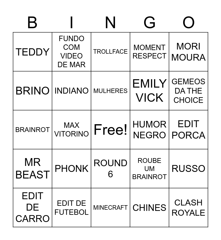 This bingo card has a free space and 24 words: PHONK, EDIT DE FUTEBOL, MULHERES, EDIT DE CARRO, MORI MOURA, TEDDY, BRINO, FUNDO COM VIDEO DE MAR, HUMOR NEGRO, ROUND 6, EMILY VICK, BRAINROT, ROUBE UM BRAINROT, RUSSO, INDIANO, CHINES, EDIT PORCA, TROLLFACE, GEMEOS DA THE CHOICE, MAX VITORINO, CLASH ROYALE, MR BEAST, MOMENT RESPECT and MINECRAFT.