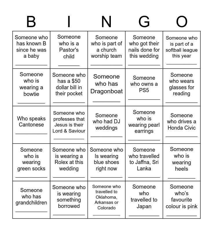 This bingo card has a free space and 29 words: Someone who has grandchildren ___________, Someone who is a first time uncle/aunt ___________, Someone who professes that Jesus is their Lord & Saviour ___________, Someone who has known R since she was a baby ___________, Someone who has known B since he was a baby ___________, Someone who is part of a church worship team ___________, Someone who has a $50 dollar bill in their pocket ___________, Someone who is wearing a Rolex at this wedding ___________, Someone who is wearing pearl earrings ___________, Someone who is wearing something borrowed ___________, Someone who drives a Honda Civic ___________, Someone who’s favourite colour is pink __________, Someone who travelled to Oklahoma, Arkansas or Colorado ___________, Someone who travelled to Japan __________, Someone who wears glasses for reading ___________, Someone who’s been to Ottawa in the past 6 months ___________, Someone who Is wearing blue shoes right now ___________, Someone who is wearing green socks ___________, Someone who is part of a softball league this year ___________, Who speaks Cantonese ___________, Someone who travelled to Jaffna, Sri Lanka ___________, Someone who travelled from out of Canada for this wedding ___________, Someone who owns a PS5 ___________, Someone who is wearing a bowtie _________, Someone who got their nails done for this wedding ___________, Someone who is a Pastor's child _______, Someone who is wearing heels _________, Someone who has Dragonboat ________ and Someone who has only 3 children ________.