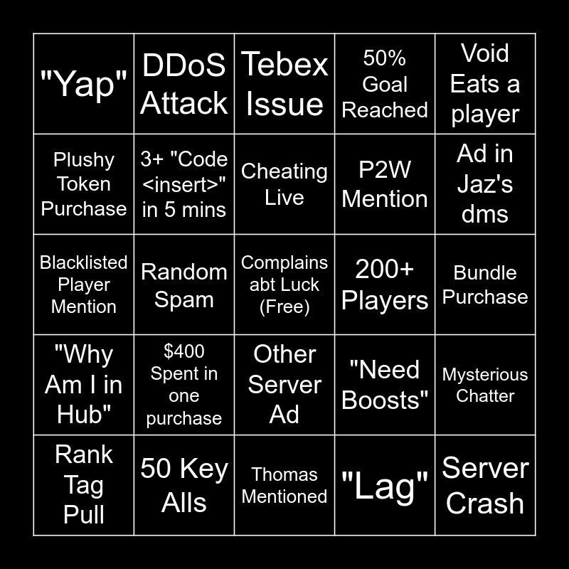 This bingo card has a free space and 24 words: Rank Tag Pull, $400 Spent in one purchase, Cheating Live, "Lag", Void Eats a player, "Yap", DDoS Attack, Tebex Issue, 200+ Players, Bundle Purchase, Blacklisted Player Mention, 3+ "Code <insert>" in 5 mins, "Need Boosts", Mysterious Chatter, Plushy Token Purchase, 50 Key Alls, Thomas Mentioned, 50% Goal Reached, Ad in Jaz's dms, "Why Am I in Hub", Random Spam, Other Server Ad, P2W Mention and Server Crash.
