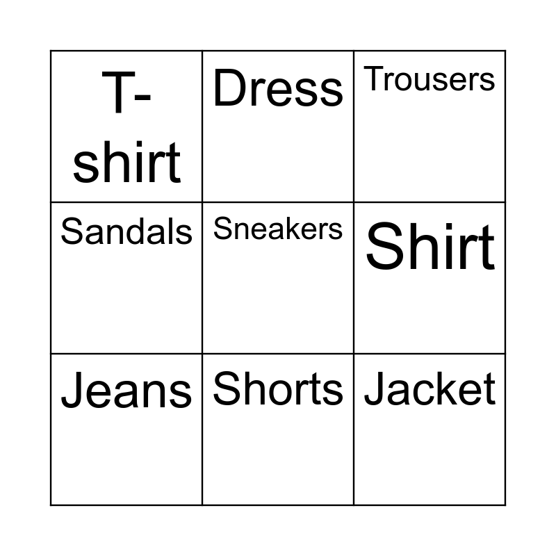 This bingo card has 9 words: Jeans, Sneakers, Trousers, T-shirt, Dress, Shirt, Sandals, Shorts and Jacket.