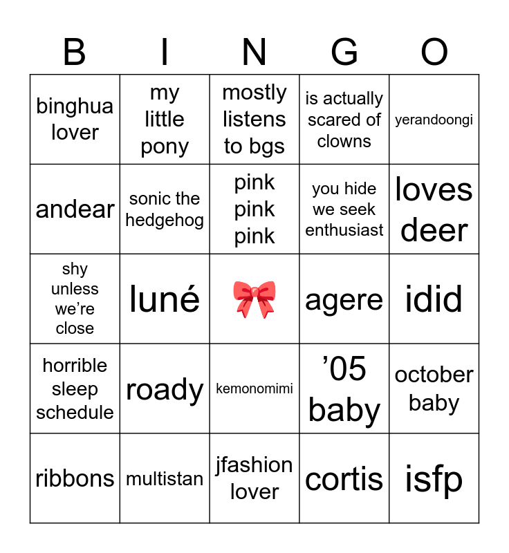 This bingo card has a free space and 24 words: roady, multistan, pink pink pink, ribbons, yerandoongi, binghua lover, andear, my little pony, agere, kemonomimi, you hide we seek enthusiast, shy unless we’re close, ’05 baby, october baby, sonic the hedgehog, cortis, idid, mostly listens to bgs, loves deer, luné, isfp, horrible sleep schedule, is actually scared of clowns and jfashion lover.