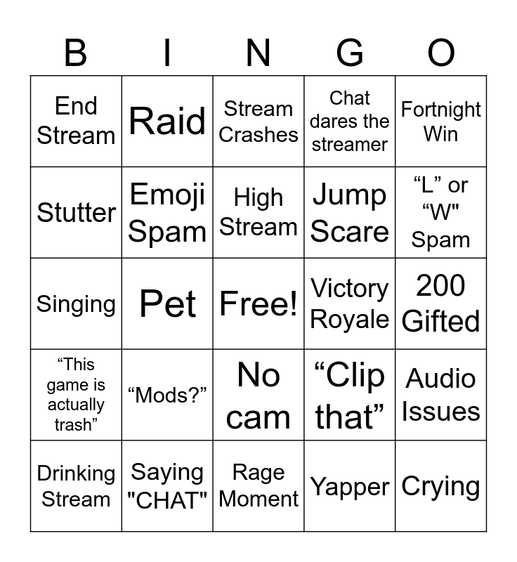 This bingo card has a free space and 30 words: Saying "CHAT", Dance, Pet, Crying, End Stream, Stream Crashes, Emoji Spam, No cam, Victory Royale, Rage Moment, 200 Gifted, Crying, Yapper, Audio Issues, “L” or “W" Spam, “Can you hear me?”, “Clip that”, “This game is actually trash”, “Mods?”, Fortnight Win, Singing, Chat agrees on something, Raid, Jump Scare, Stutter, Chat dares the streamer, Audio Issues, Drinking Stream, High Stream and Yelling.