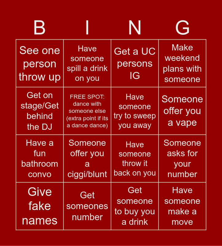 This bingo card has 16 words: Get someones number, Someone asks for your number, Get a UC persons IG, See one person throw up, Have a fun bathroom convo, Have someone spill a drink on you, Have someone throw it back on you, Get someone to buy you a drink, Get on stage/Get behind the DJ, FREE SPOT: dance with someone else (extra point if its a dance dance), Give fake names, Make weekend plans with someone, Someone offer you a ciggi/blunt, Someone offer you a vape, Have someone try to sweep you away and Have someone make a move.